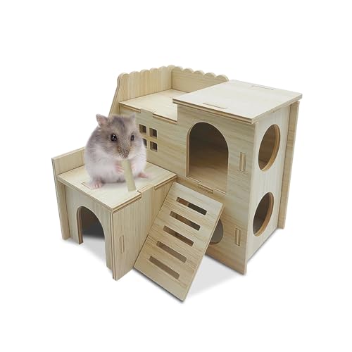 Hamster Haus Holz, 2 Etagen mit Leiter, Spielplatz, Haus für Goldhamster, Zwerghamster, Rennmäuse, Degus