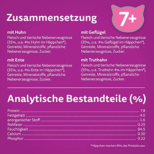 Jede köstliche Rezeptur enthält 100 % hochwertige Zutaten und deckt alle täglichen Bedürfnisse deiner 7+ Katze